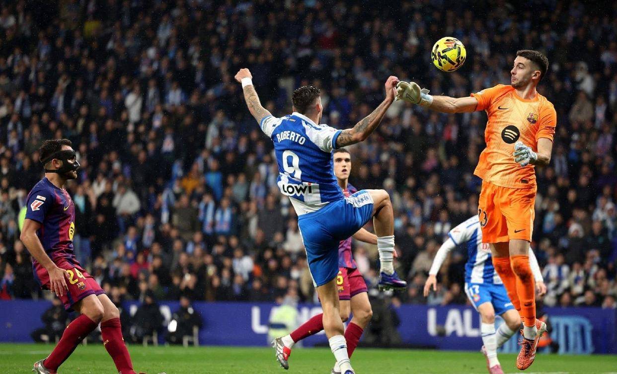 然而,比赛过程却远非比分显示的那么轻松。西班牙人队凭借主场之利,气势如虹,一次又一次地冲击着巴萨的防线。第86分钟,记分牌上依旧是令人窒息的0-0,主队球迷的助威声震耳欲聋。巴萨主帅弗里克眉头紧锁,焦急地站在场边,他已孤注一掷地换上了费尔明和莱万多夫斯基,试图打破僵局。